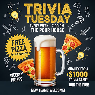 Weekly trivia night with teams of up to 6 competing for prizes and the trophy.