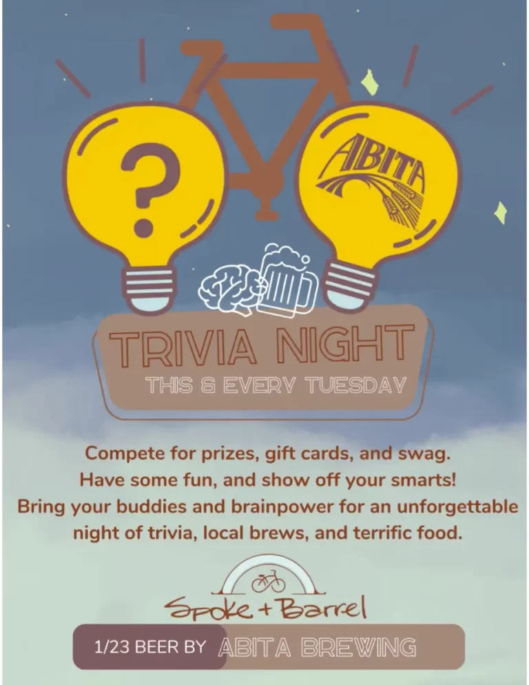 Trivia at Spoke & Barrel Eatery is free, every Tuesday 6:30-8:30 PM, with food, drinks, and prizes.